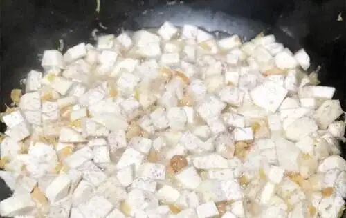 步骤四:锅里放油,将干贝和虾米爆香盛起备用。同样,翻炒芋头大概2分钟,加适量盐和胡椒粉。把刚刚炒过的虾米和干贝一起放到芋头中,加入约200克水煮一两分钟后倒入粉浆,快速搅拌均匀。