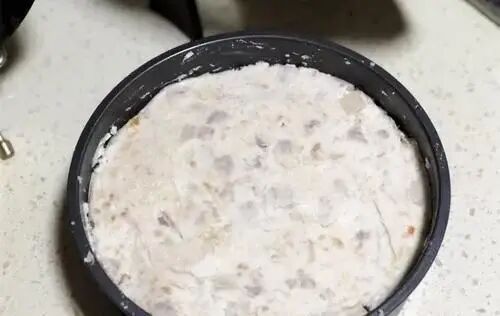 步骤五:把混合好的芋头糕胚放入蒸盘中(我用的是8寸蛋糕模),压实,整平。然后沸水蒸45分钟。