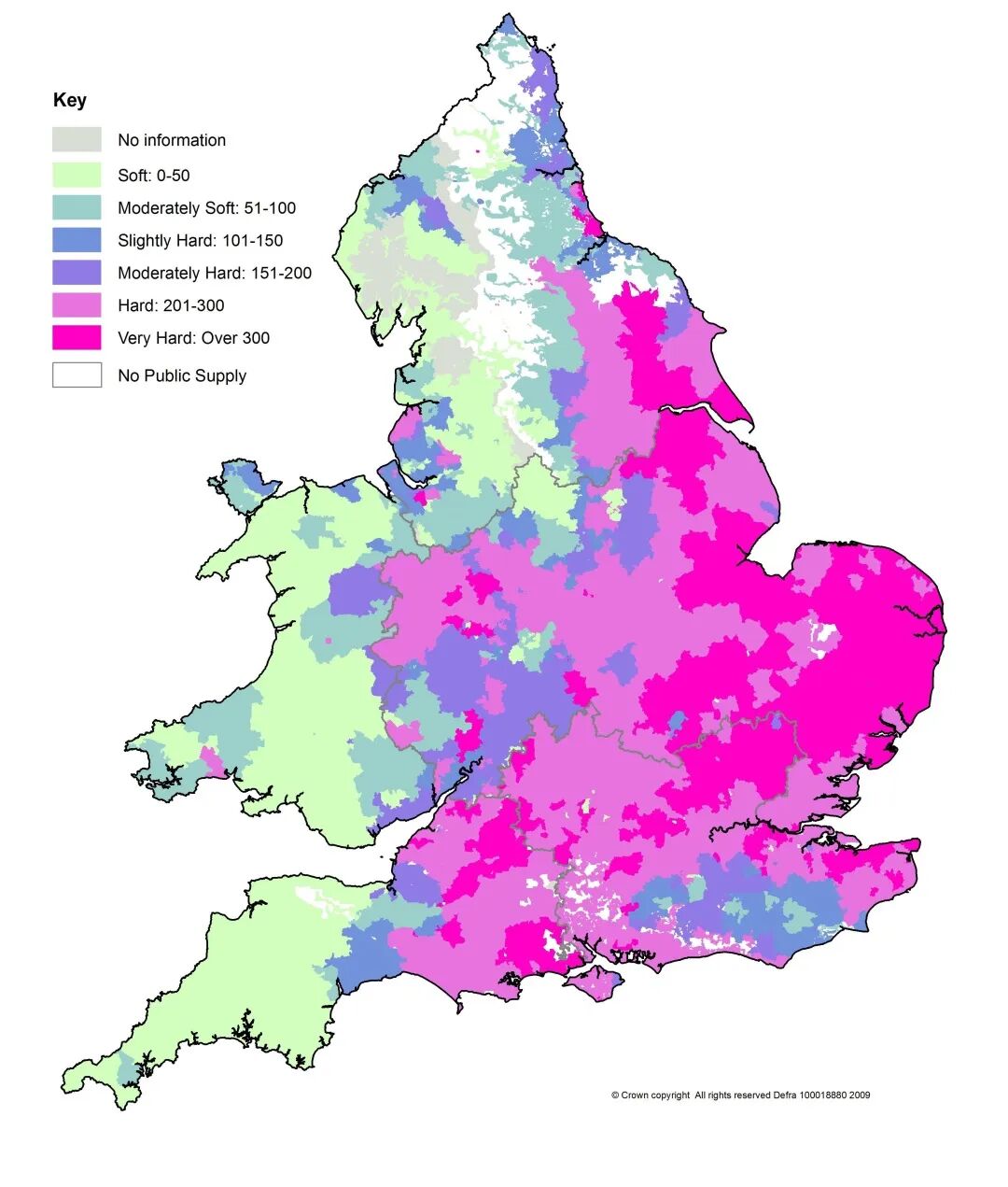 英国水务公司表示,英国约60%的地区属于硬水或极硬水,许多地区的碳酸钙 (硬水的主要矿物质成分) 含量超过每升200毫克。