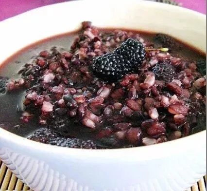 红枣5枚,核桃仁、桑椹子各10克,黑大豆30克,粳米50克。