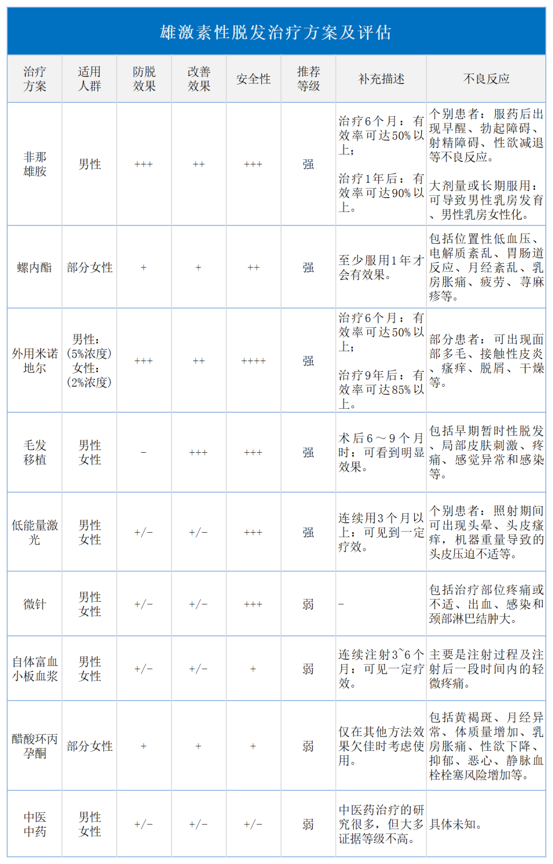 对于AGA的治疗,强调的是早期治疗和综合治疗,包括系统用药、局部用药、毛发移植术和低能量激光治疗等,不同的治疗方案其安全性、防脱效果、改善效果各有不同,需根据患者的实际情况及续期综合判定并选择[1,3,4,5,6]。