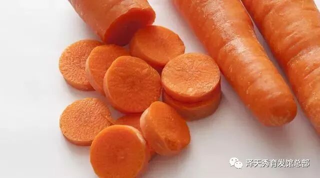 胡萝卜:胡萝卜中含有大量的维生素A,是能够让头发健康生长的生活必要。是健康的头发不可或缺的,因此胡萝卜是脱发着餐桌上常见的菜品。