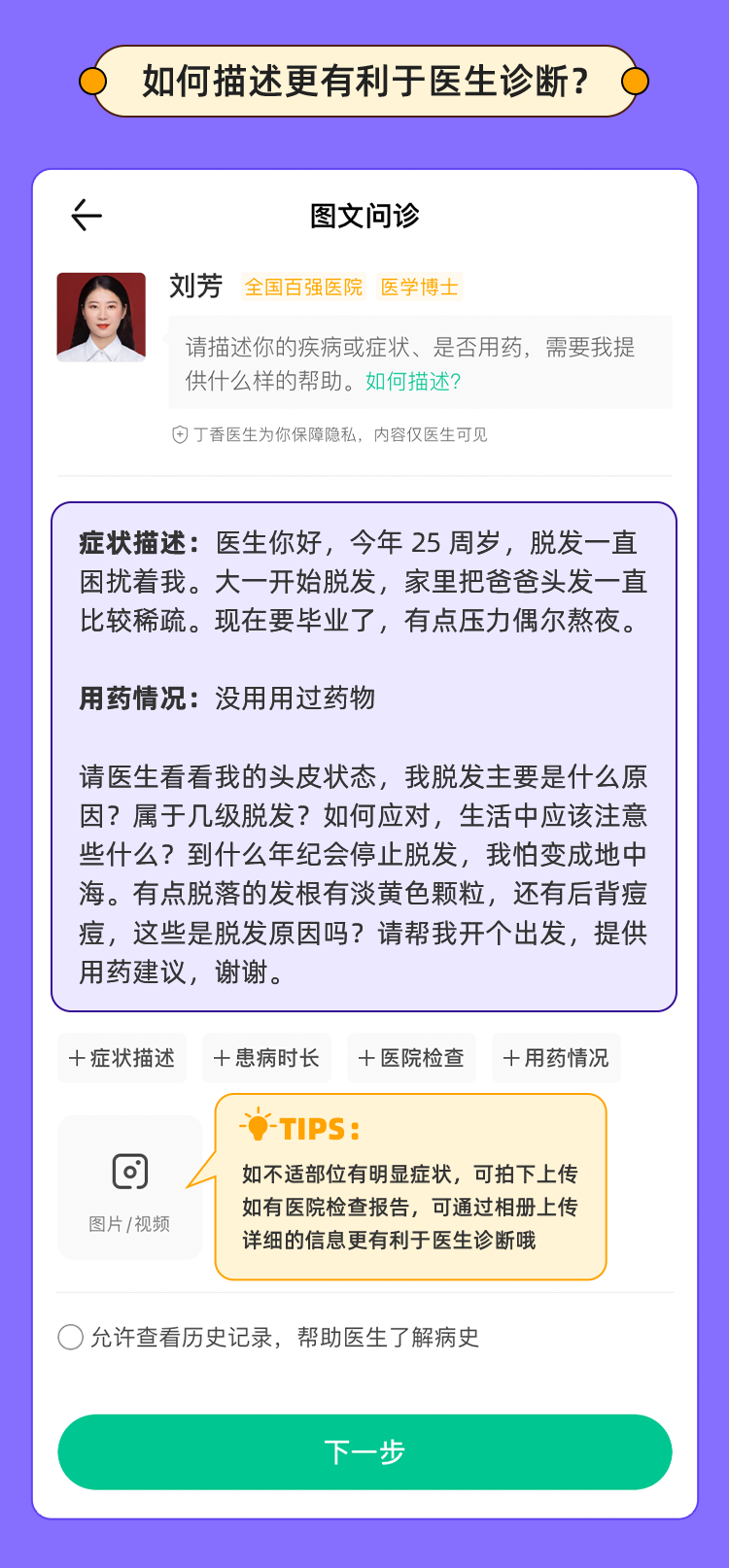 把自己头皮脱发情况拍照给医生,描述一下症状、持续时间、用药情况等,专业医生就可以线上为你诊断,还能线上开药送到家,快捷方便。
