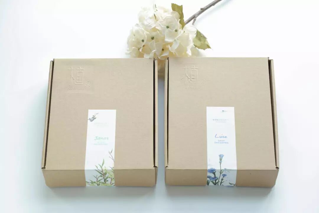 收到的外包装是牛皮纸盒,印着植观的 logo 印花。开口处用小清新的插画贴纸密封着,对应着不同系列的颜色,细节非常到位。