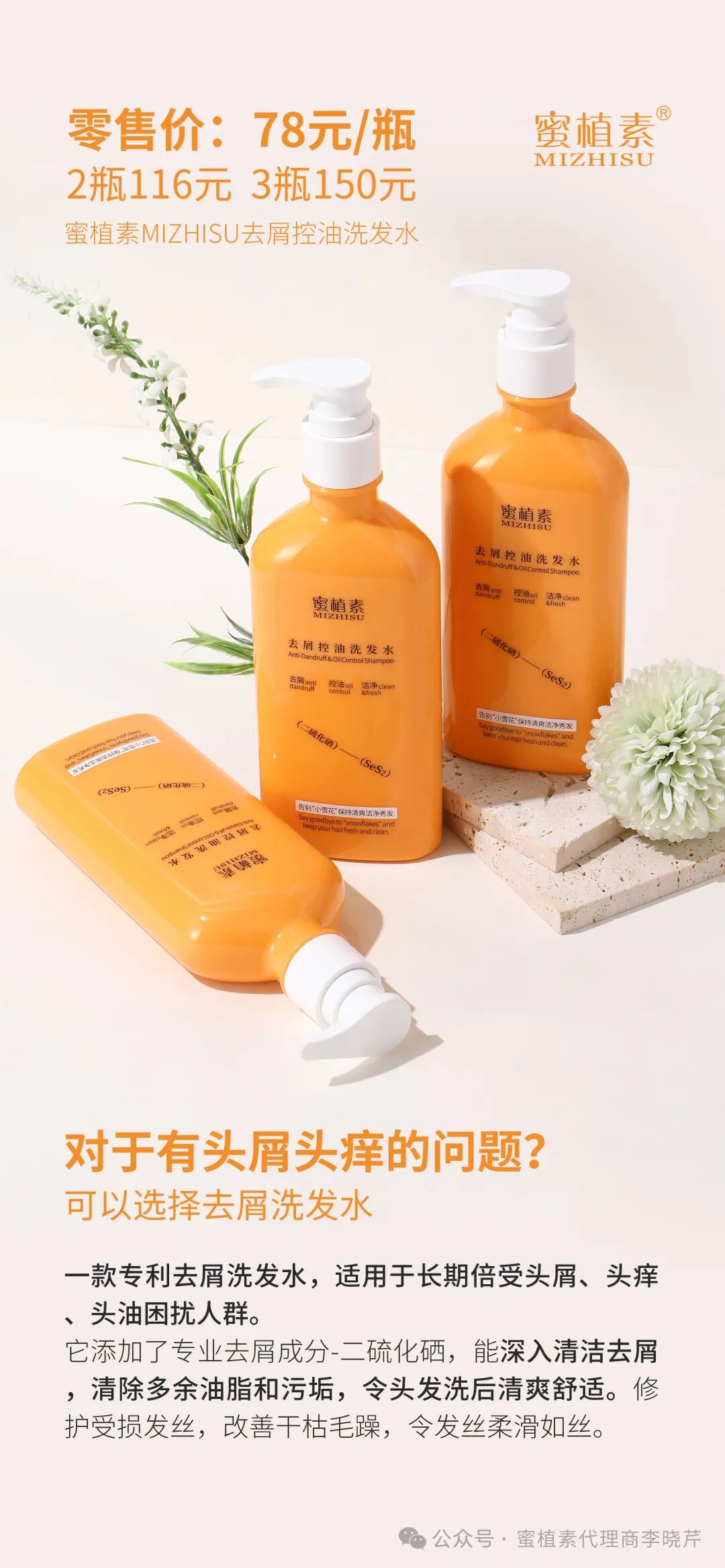 这是一款专利去屑洗发水,适用于长期倍受头屑、头痒、头油困扰人群。