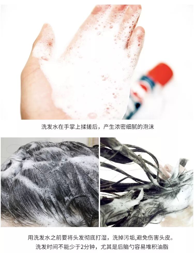 【注意事项】洗发时间最短不能少于2分钟,3-5分钟效果最好!尤其是后脑勺附近容易堆积油脂,比起其他部位更要花时间清洗。建议涂抹后停留三分钟短时间按摩!