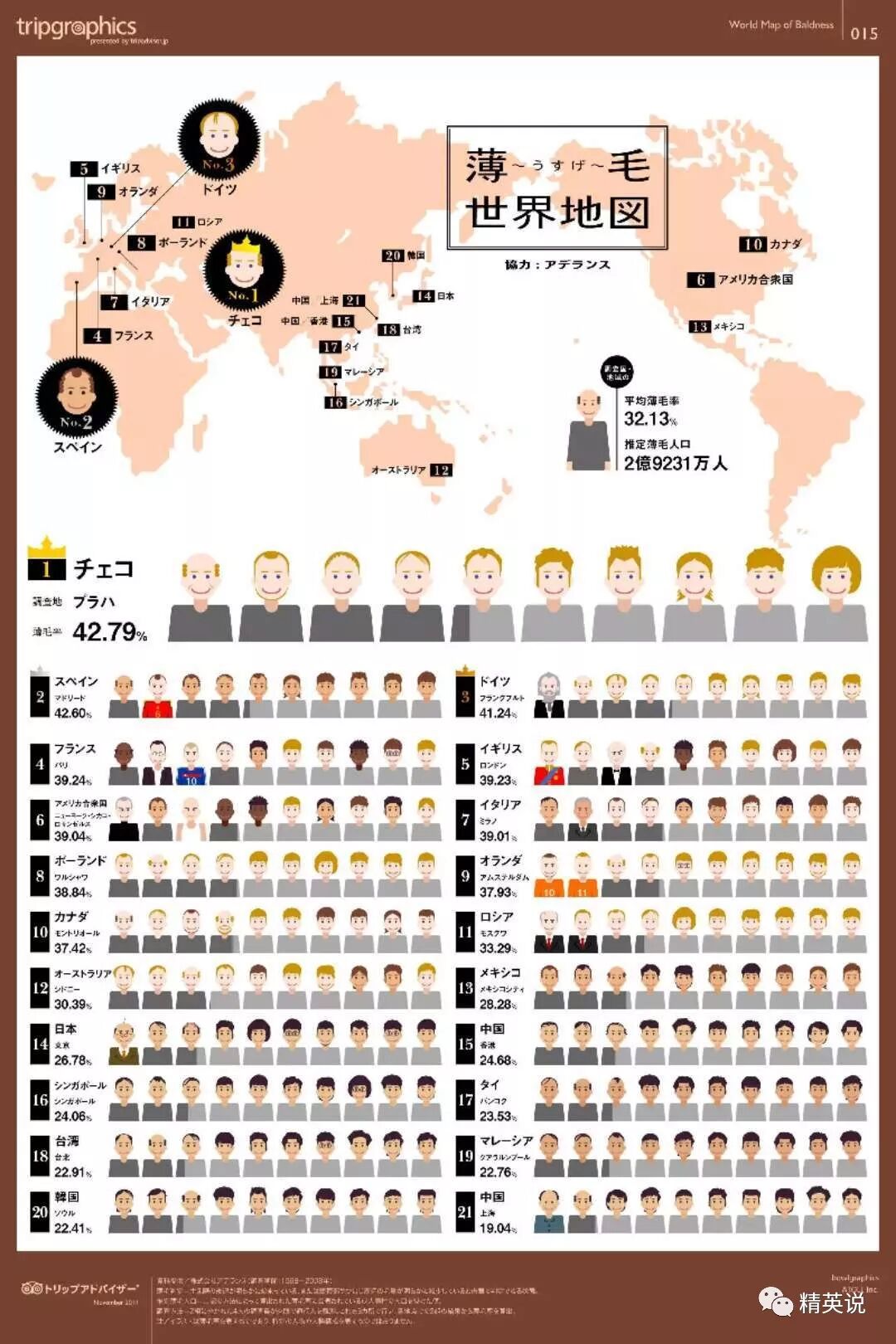 日本网站 Trip Advisor在2011年搞了个世界男性秃顶统计,发现脱发最凶猛、秃头最多的国家是捷克共和国,调查地布拉格以42.79%的秃顶率荣登世界第一。