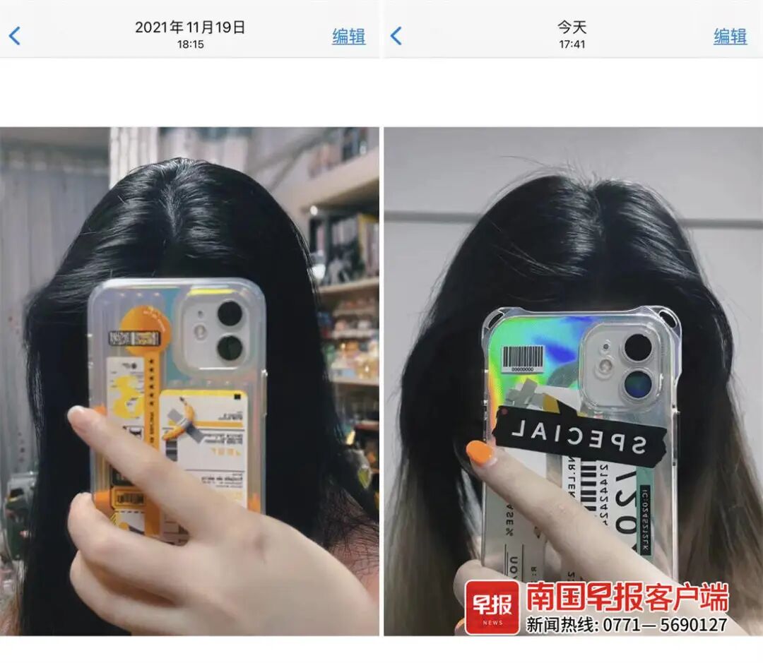 不过,黄女士并不焦虑,因为她拍了前后对比的两张照片,头顶从视觉上看并没什么变化。