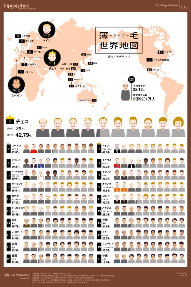 日本网站 Trip Advisor在2011年搞了个世界男性秃顶统计,发现脱发最凶猛秃头最多的国家是捷克共和国,调查地布拉格的秃顶率以42.79%荣登世界第一。