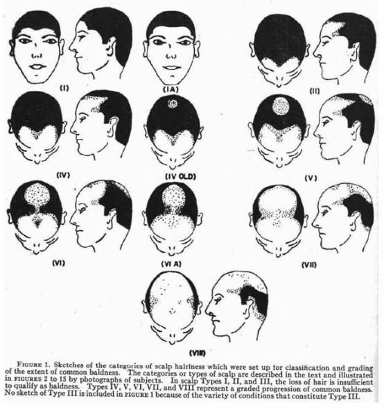 汉密尔顿的研究具有开创性,但他并没有就此停止,而是转向研究具体的脱发模式。事实上,这些模式都很有规律,汉密尔顿在1951年表示,从发际线后退到头顶脱发再到完全脱发(除了两鬓的头发),男性的脱发模式可以归结为八类。