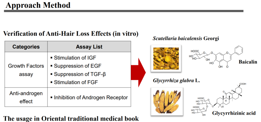 然后是黄芩根+甘草根的组合,其中的黄芩提取物能有效抑制雄激素受体,改善雄脱;