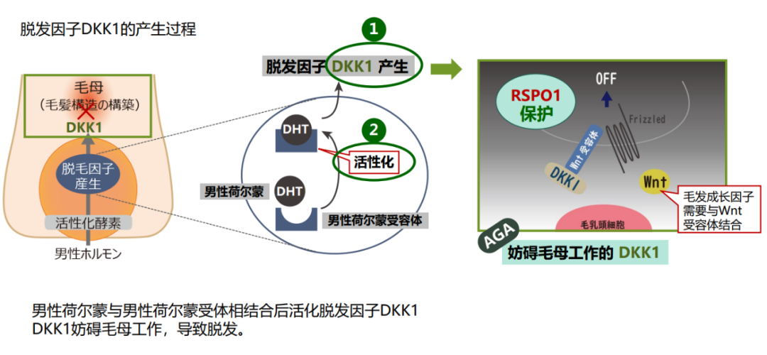 此外,皮肤中还有着一个脱发因子DKK1,它会抑制在毛发生长循环中起重要作用的Wnt/β-连环蛋白信号通路的传导,促使毛囊进入退行期,从而促进脱发。