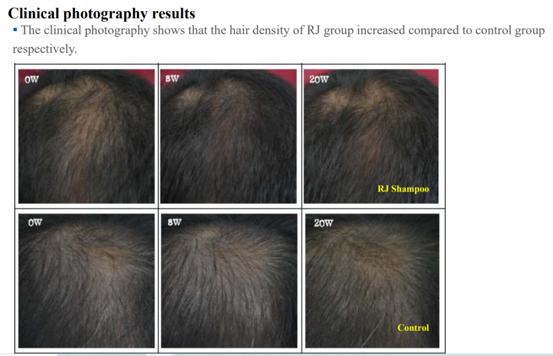 爱茉莉临床证实,与使用不含这两个成分但其他成分相同的洗发水相比,使用含有(0.1%黄芩根+0.1%甘草根)的洗发水更能增加志愿者头发数量、增粗头发。