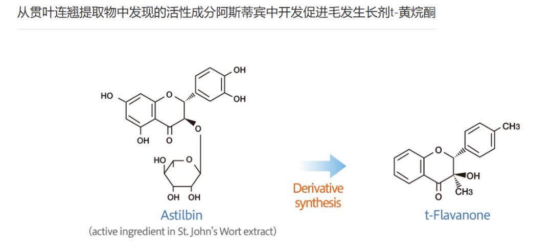 之后花王分离出了贯叶连翘中起育发作用的活性成分Astilbin,并进一步改造了它的结构,从而开发了花王独家的防脱育发成分——t-黄烷酮。