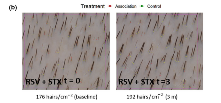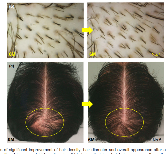 6个月后,与安慰剂组相比,腺苷使用者们的头发里粗头发所占的比例、头发的密度都显著增加了。