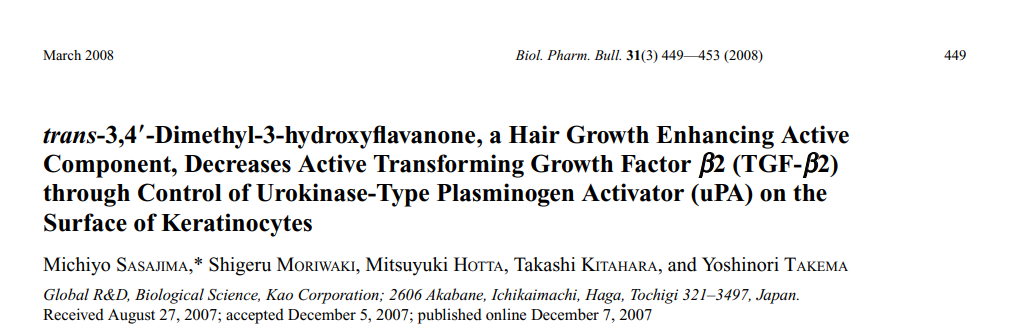 这里我们需要介绍一类抑制毛发生长的效果很强的生长因子——TGF-β家族,而t-黄烷酮能减少其中的TGF-β2活化,从而可以促进头发生长。