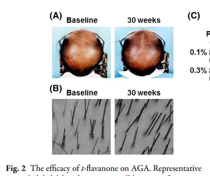 30周后发现,0.1%和0.3%t-黄烷酮都显著改善了志愿者们的雄激素性脱发,并且很多t-黄烷酮的使用者们都报道他们的脱发减少了。
