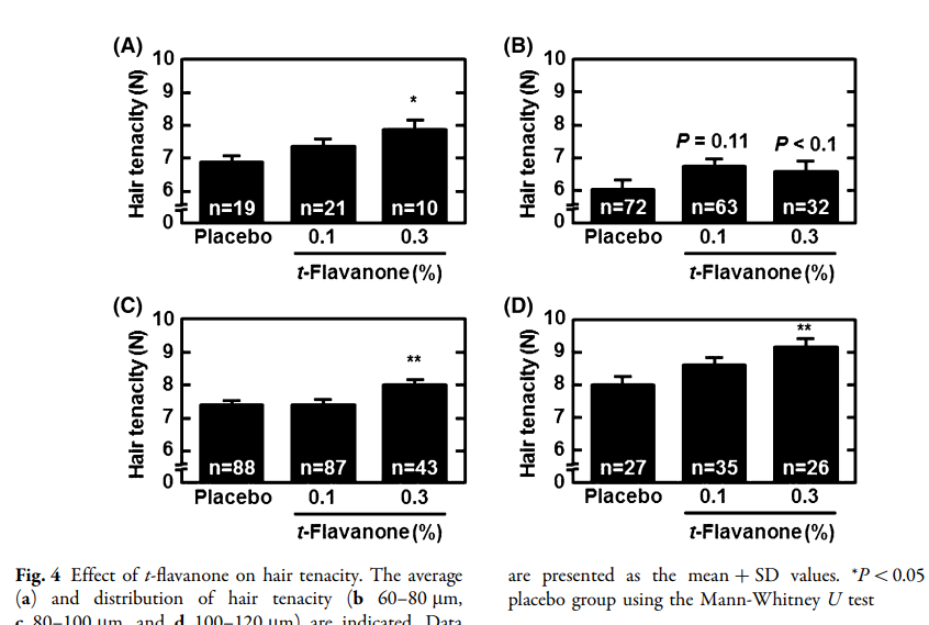 而拉发实验则发现,0.3%t-黄烷酮使用者们的头发韧性显著增加,头发更难被拔下来。