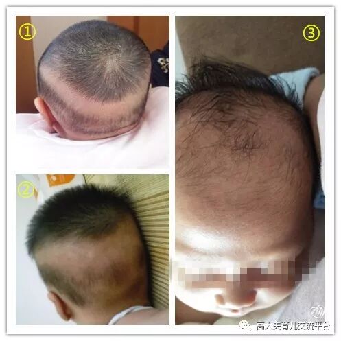 上图①②为枕秃。③图提示孩子的脱发呈现为圆圈型,和出生时孩子使用过胎吸损伤头皮或者生后头部包裹太紧有关,但孩子的脱发对以后的头发生长无影响。