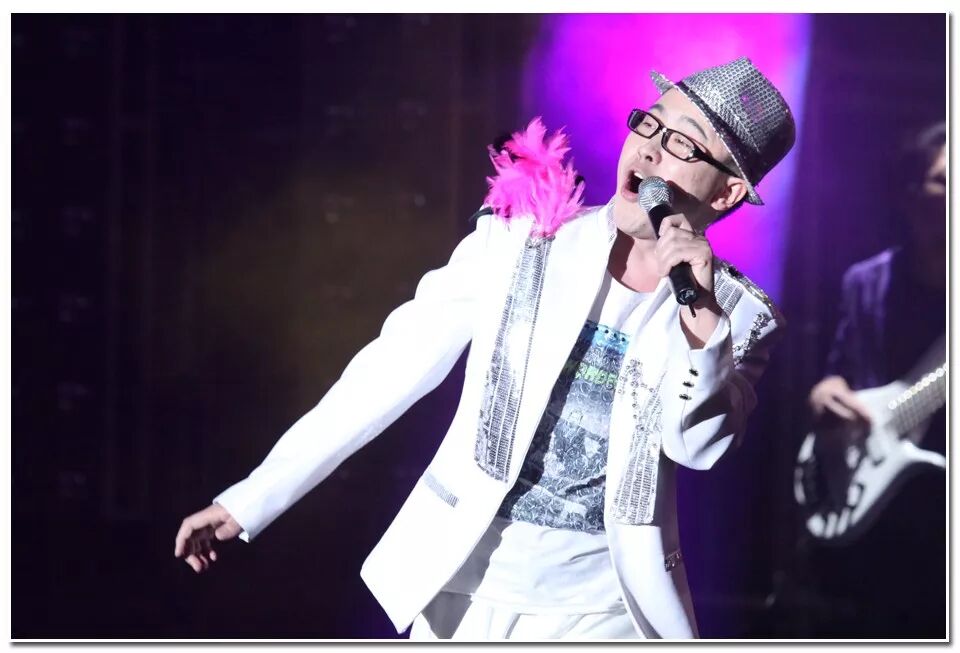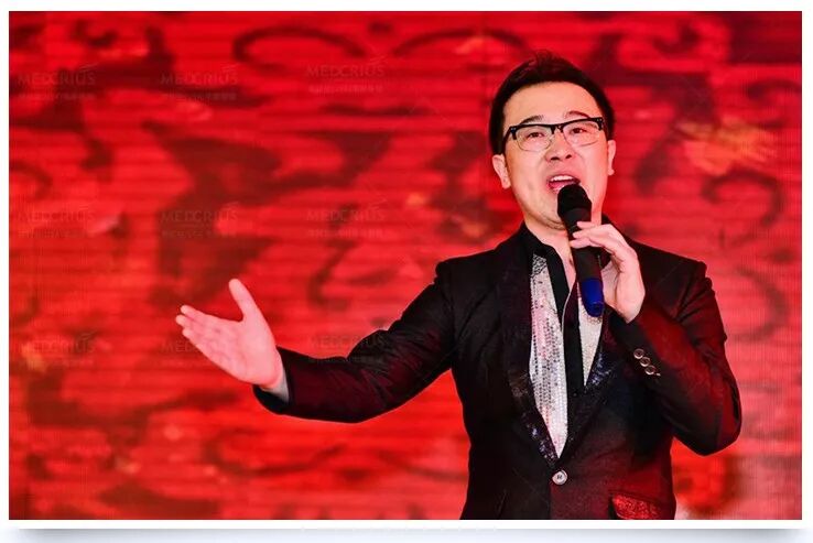2018年1月,企业年会上台表演时的照片,头顶用黑粉掩饰。