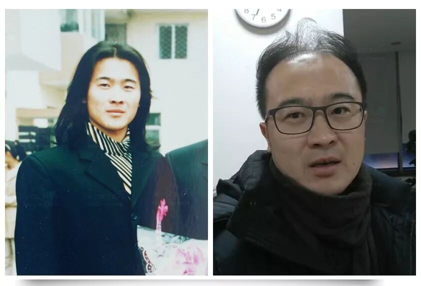 2003年5月,脱发前(左)头发很厚、发质很粗