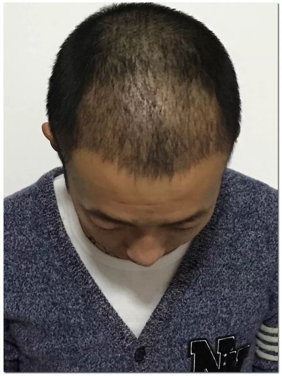 2016年11月17日,植发前,前额光秃,发际线后退严重,中间发量稀疏,看起来至少45岁!
