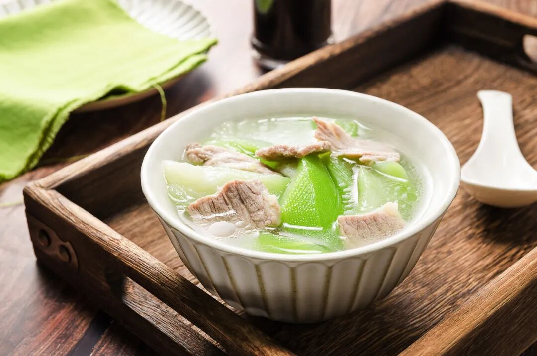 【原料】瘦猪肉50克,丝瓜25克,盐、味精、清汤、麻油各适量。