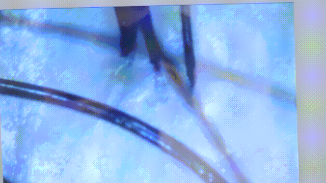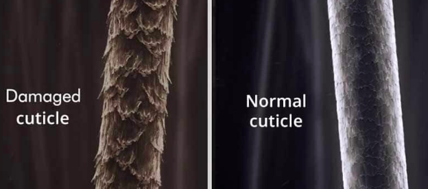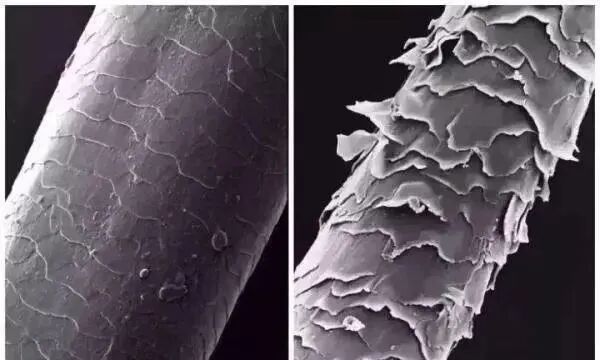 我们正常的头发鳞片是闭合的,你们看放大后的发丝,鳞片打开后超级爆炸。