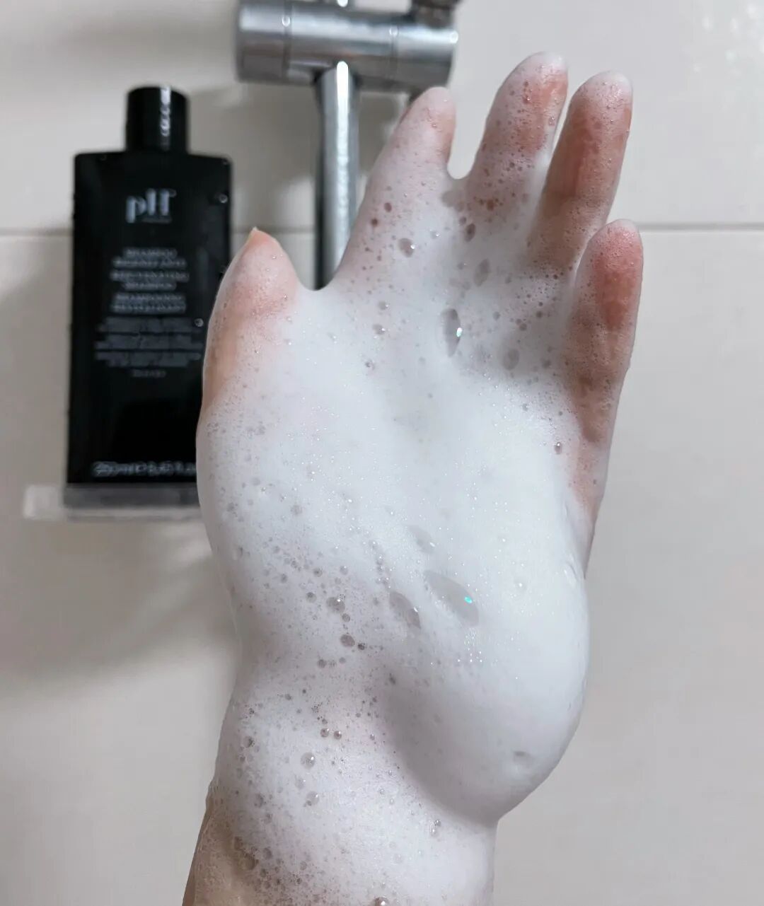 它在头上搓出来的泡跟传统的贵妇洗发完全不同,虽然同样是非常细腻的小泡,但P家的泡沫太柔了,柔到触感都是绵的。