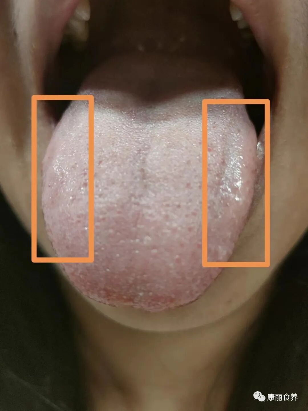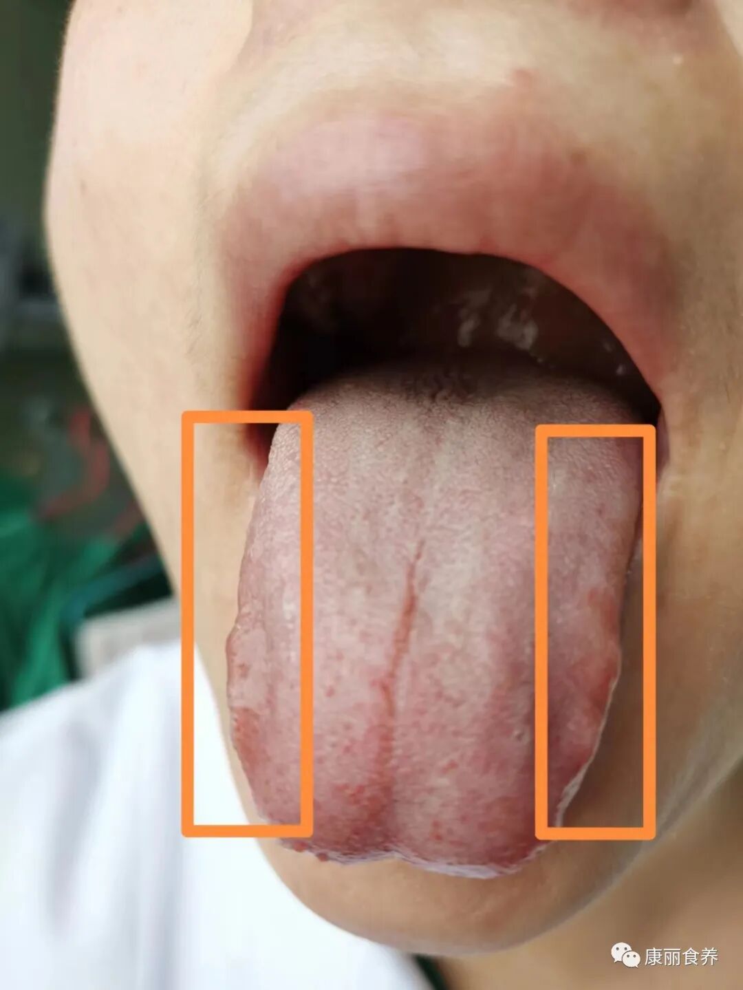 舌两边肝胆区凹陷、颜色淡白,淡嫩。是肝血不足的表现。