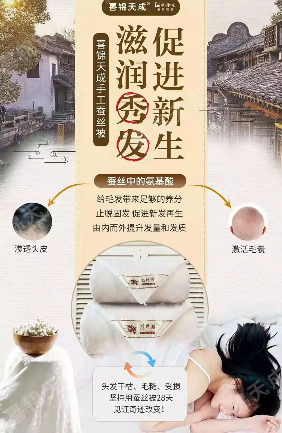在夜间盖着喜锦天成手工蚕丝被,其释放的氨基酸会为你整晚滋养秀发,预防发质干枯断裂,令头皮达到健康平衡,令秀发持久清新柔顺。