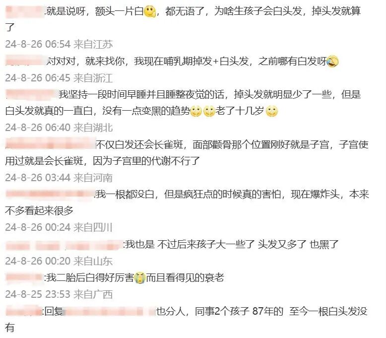 评论区,一些网友也分享了自己产后掉发,甚至白发的经历。同样是产后,有人掉发严重,有人没有掉发;有人产后3个月开始掉发,有人产后8个月开始掉发。