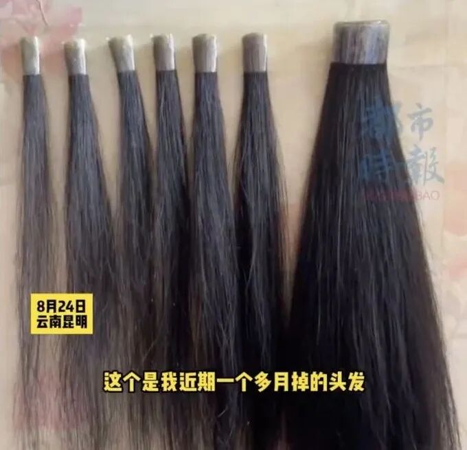8月25日,女子产后掉发1个月掉出1把马尾的话题登上社交平台热搜。据云南都市时报,昆明一女子产后掉发严重,其收集的一个月所掉头发可捆成1束马尾。