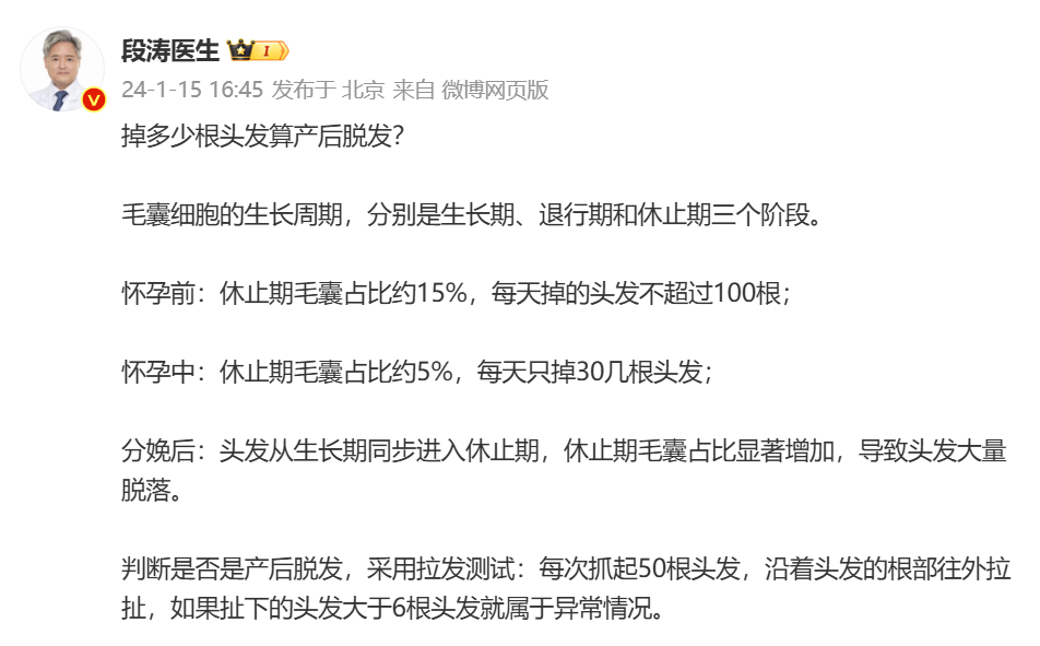 他还提醒,如需判断是否产后脱发,可采用拉发测试:每次抓起50根头发,沿着头发的根部往外拉扯,如果扯下的头发大于6根头发就属于异常情况。