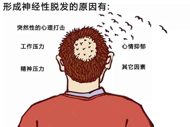 神经性脱发也叫斑秃。精神压力,工作压力,突然性的心理打击和心情抑郁等是造成神经性脱发的主要原因。