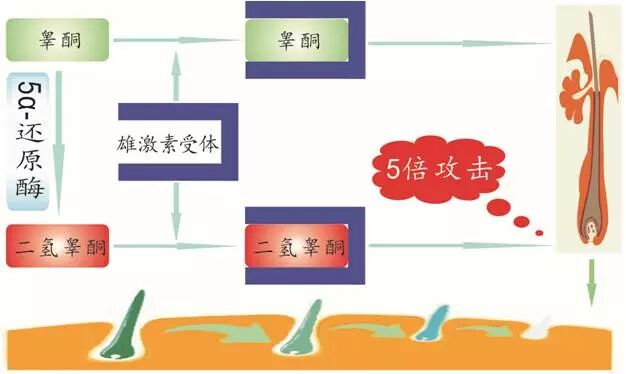 雄激素中的睾酮在5α-还原酶的作用下形成二氢睾酮,二氢睾酮会抑制毛乳头的生长发育,干扰毛囊细胞的生长代谢,从而引脱发。