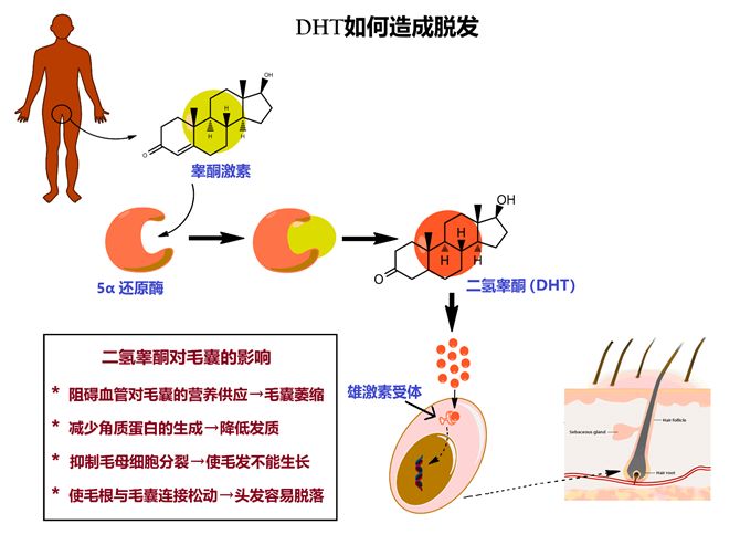 前面提到,人体中的5α还原酶,负责将睾酮转化为DHT,而DHT会攻击毛囊,造成毛囊萎缩,继而导致脱发。