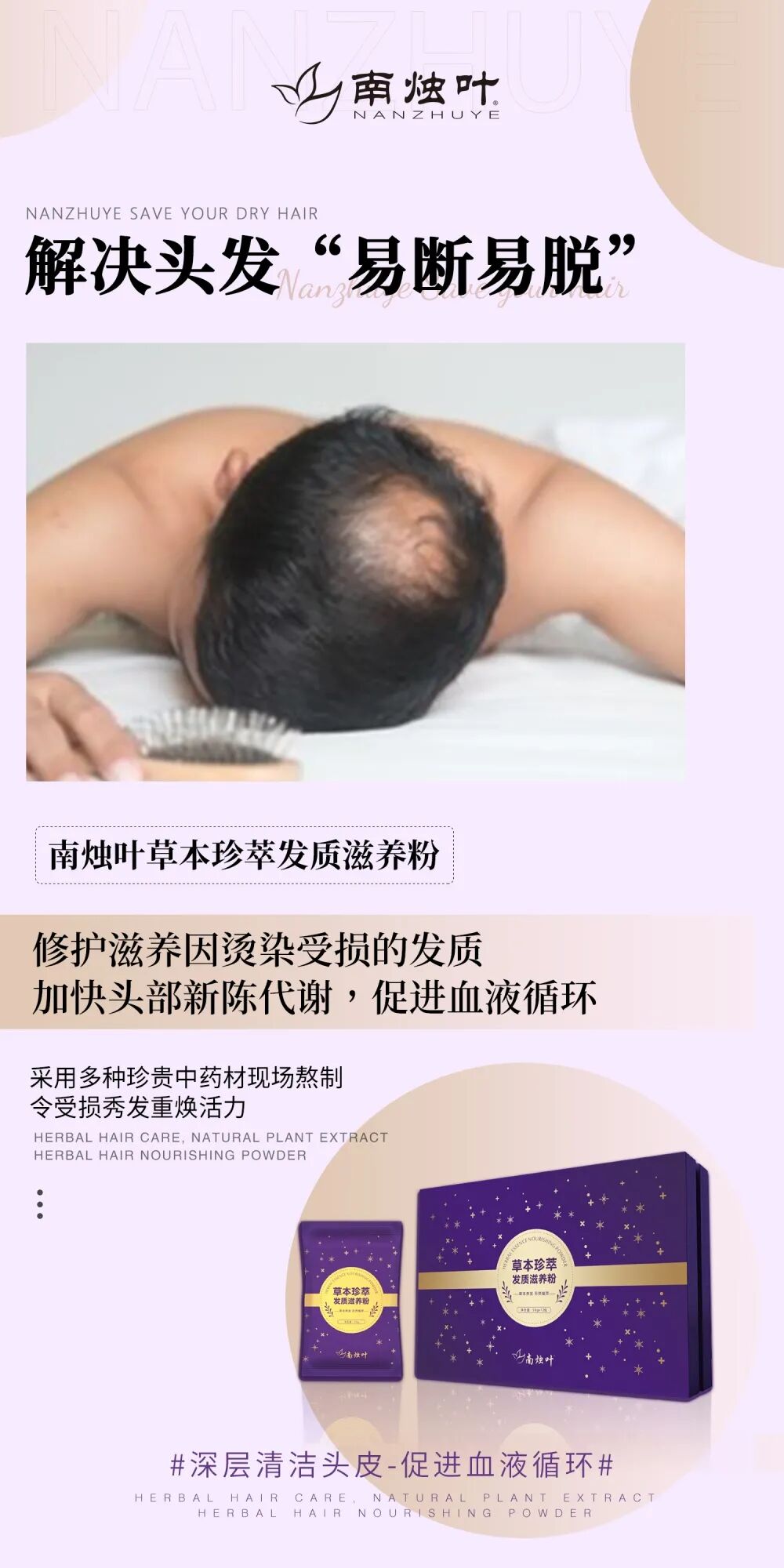 南烛叶·草本珍萃发质滋养粉,富含茶麸,皂角,何首乌,黑芝麻,夜交藤,五味子,苦参,当归,人参提取精华等,采用先进的低温破壁技术工艺,可以保留植物的活性成分,提高药效,低温技术,稳定植物原有的功效。精华粉直径小于人体毛孔,提高吸收率。现场熬制,充分提取植物有效成分。
