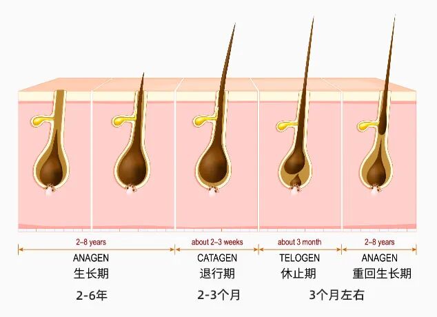 毛发的生长周期分为四个阶段:生长期(2-6年),退化期(2-6个星期),休止期(3-4个月),重回生长期。