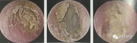 短帚霉菌感染导致外耳道类似耵聍干痂上散布白色粉末状霉菌样物。