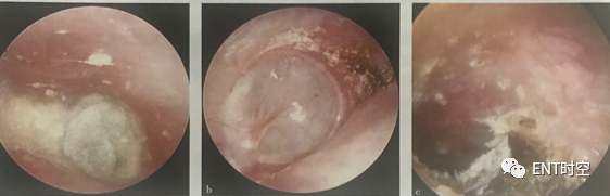 外耳道或乳突根治腔内若有脓性结痂,上可见菌丝体,清除后可见皮肤充血、肿胀、糜烂。