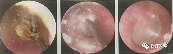 外耳道真菌病主要侵及皮肤的角质层,用溶液(消毒生理盐水、过氧化氢溶液、醋酸铝溶液等)溶解真菌复合物后,在耳内镜下用小吸引器吸引黏脓性分泌物及溶解后的湿性产物,用干棉签拭干后再用药,可以使药物与受损皮肤充分接触,从而最大程度减轻不适、提高疗效、缩短病程。