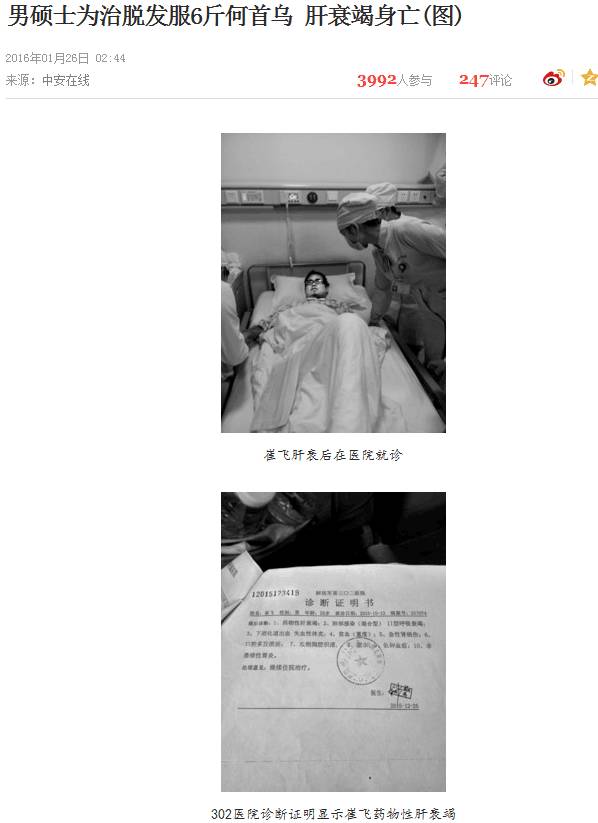 作为医生,我个人比较倾向于西医治疗而不是中医治疗。并不是我不了解中医,而是中医在治疗脱发上的理论一直是滞后的,到现在还认为是肾虚、气血不足导致脱发,其实那只占很小一部分原因,会误导很多人。此外我曾经看过一条新闻,大学生用何首乌治疗脱发,结果剂量太大导致肝衰竭死亡,这虽然是个例,但是也告诉我们盲目迷信中医后果是很严重的▼