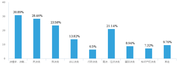 刑法类、商经类的比例不相上下,分别是23.58%和21.14%。