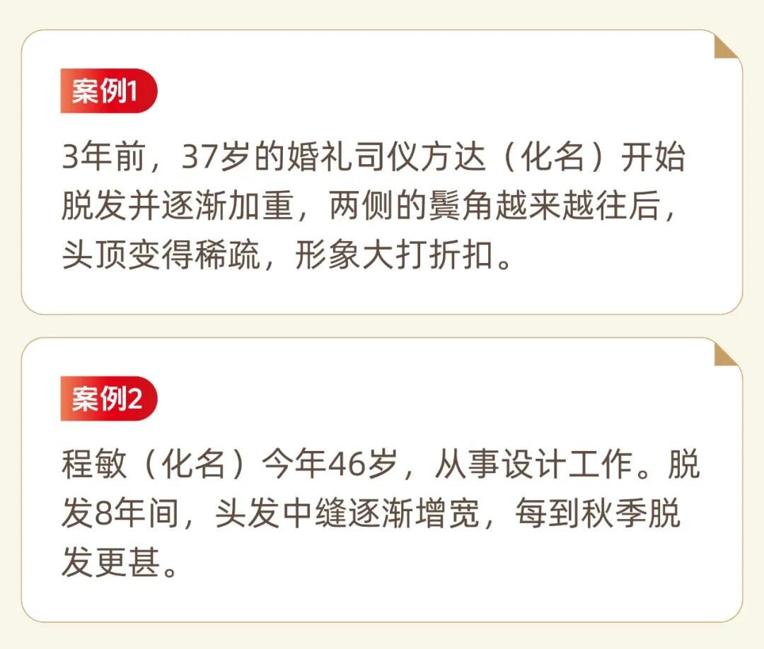 雄激素性脱发患者多为三四十岁的男性,有些人没几年的工夫,就从发量王者到严重秃顶。当然,女性患者也不在少数。浙江省皮肤病医院毛发专科副主任医师尤建华介绍,上述案例临床接诊后均诊断为雄脱。