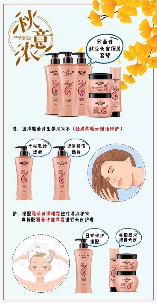 雅菲诗丝滑洗发水或者雅菲诗赋活修护洗发水搭配雅菲诗调理霜进行滋润护发,同时再搭配雅菲诗健发霜按摩头皮和头发,每周坚持2次头皮按摩,就可以做到秋冬少掉发,保证新发正常的生长。