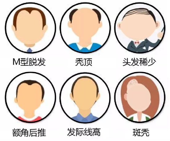 男生,多出现发际线逐渐后退,头顶集中秃,女生多出现头顶头发逐渐稀疏。