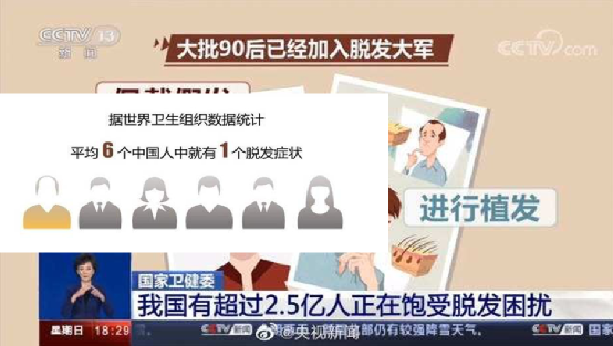 根据国家卫健委发布的脱发人群调查数据,中国已经有超过2.5亿人正饱受脱发的摧残。也就是说,平均每 6 人里就有 1 人头秃。90 后到 00 后几乎无一幸免。