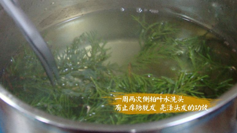 50-100克左右的侧柏叶,在水煮沸之后再加入,用余温把侧柏叶浸泡一会儿。过滤之后的水就可以代替洗发水来洗头发啦。和平时洗头发一样,每周两次左右就可以喽。