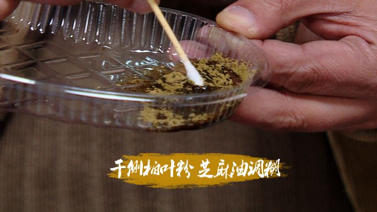 干侧柏叶磨成粉,加入适量的纯芝麻油,调成这样的糊状就可以了。